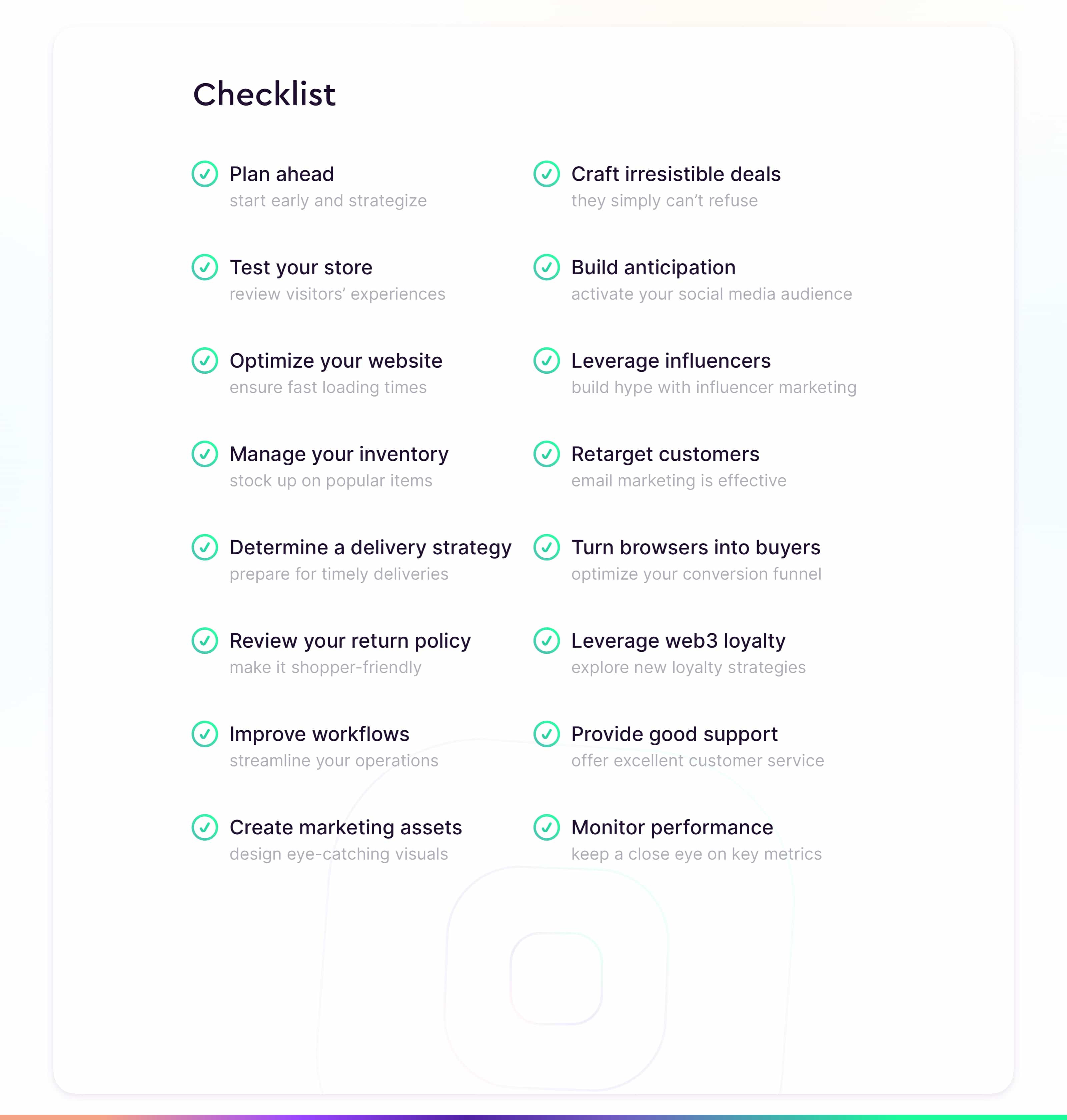 Now that your website is ready, let's dive into the essentials of preparing your e-commerce store for BFCM. We've compiled a comprehensive checklist, ensuring you don't miss a beat. It covers everything from planning ahead to monitoring performance.
